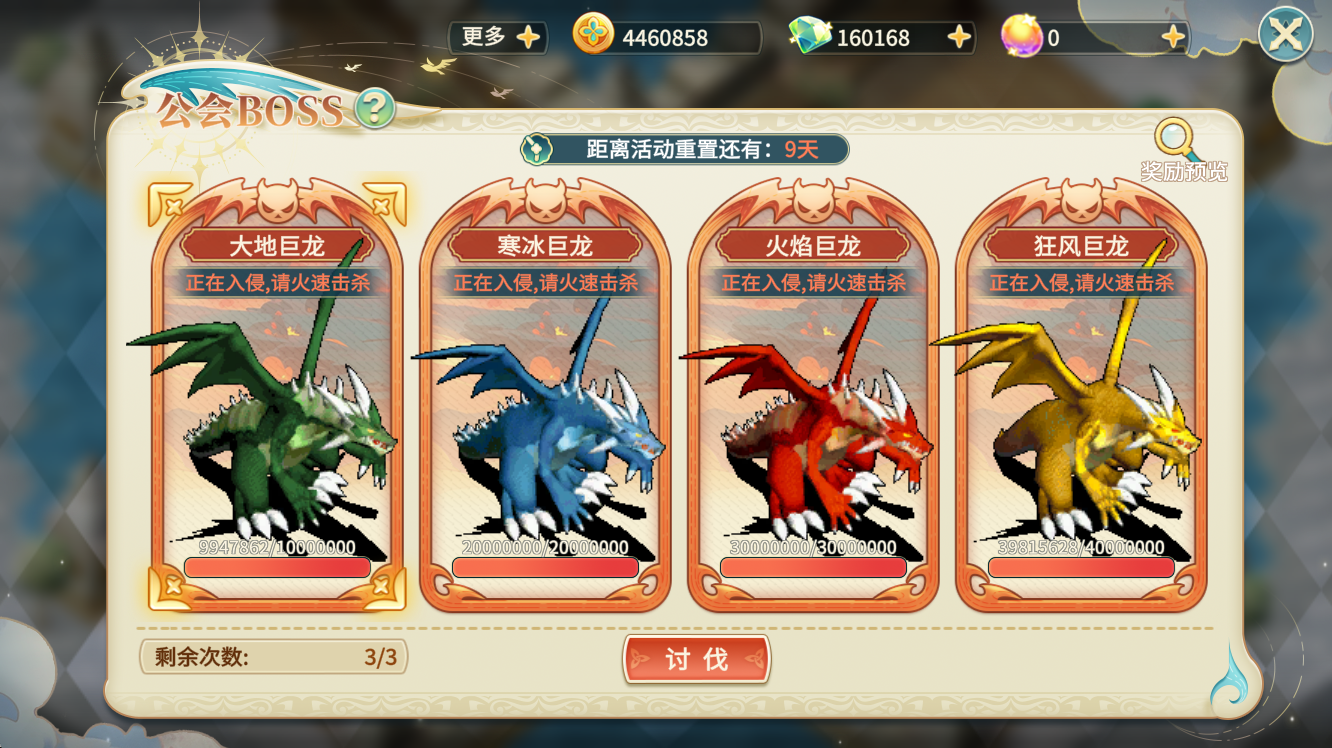 讨伐活动时间内,全公会玩家合力击败BOSS后,可获得奖励