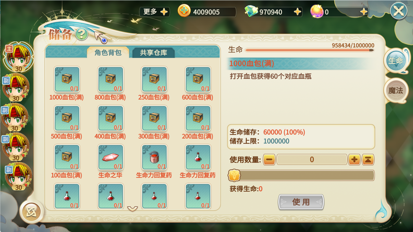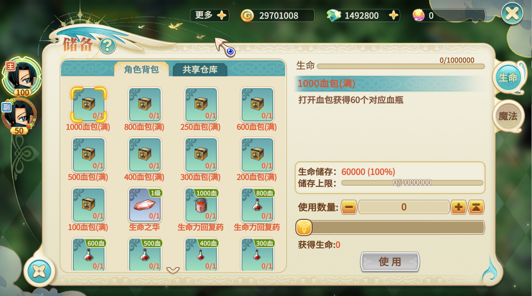 血气储备可在战斗结束后自动补满角色及宠物的血量和气力,不同的血气储备道具增加的储备量不同。